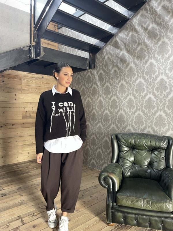 Pantalone modello balloon a vita medio alta con tasche laterali ed elastico in vita dietro.