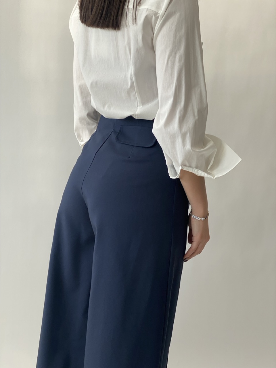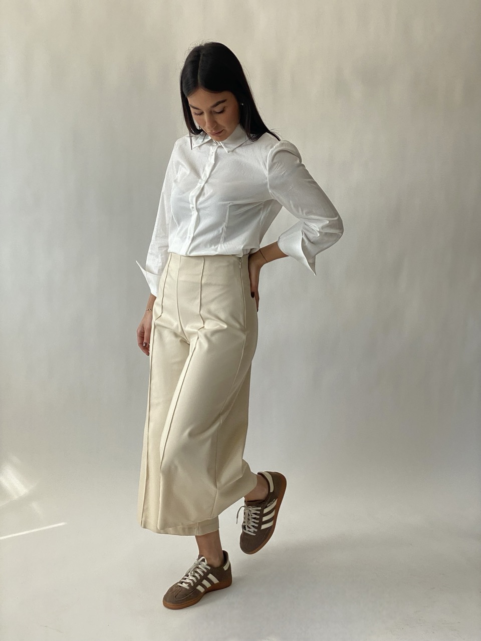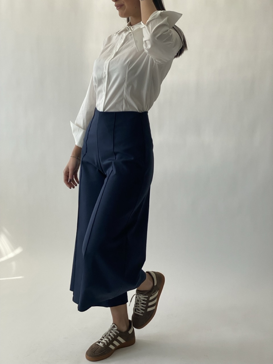 Pantalone modello gaucho a vita medio alta con zip laterale come chiusura.