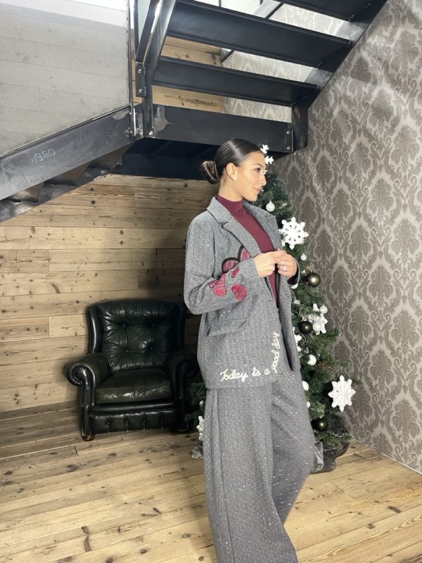 Pantalone modello a palazzo con elastico in vita, tasche laterali e strass dettaglio.