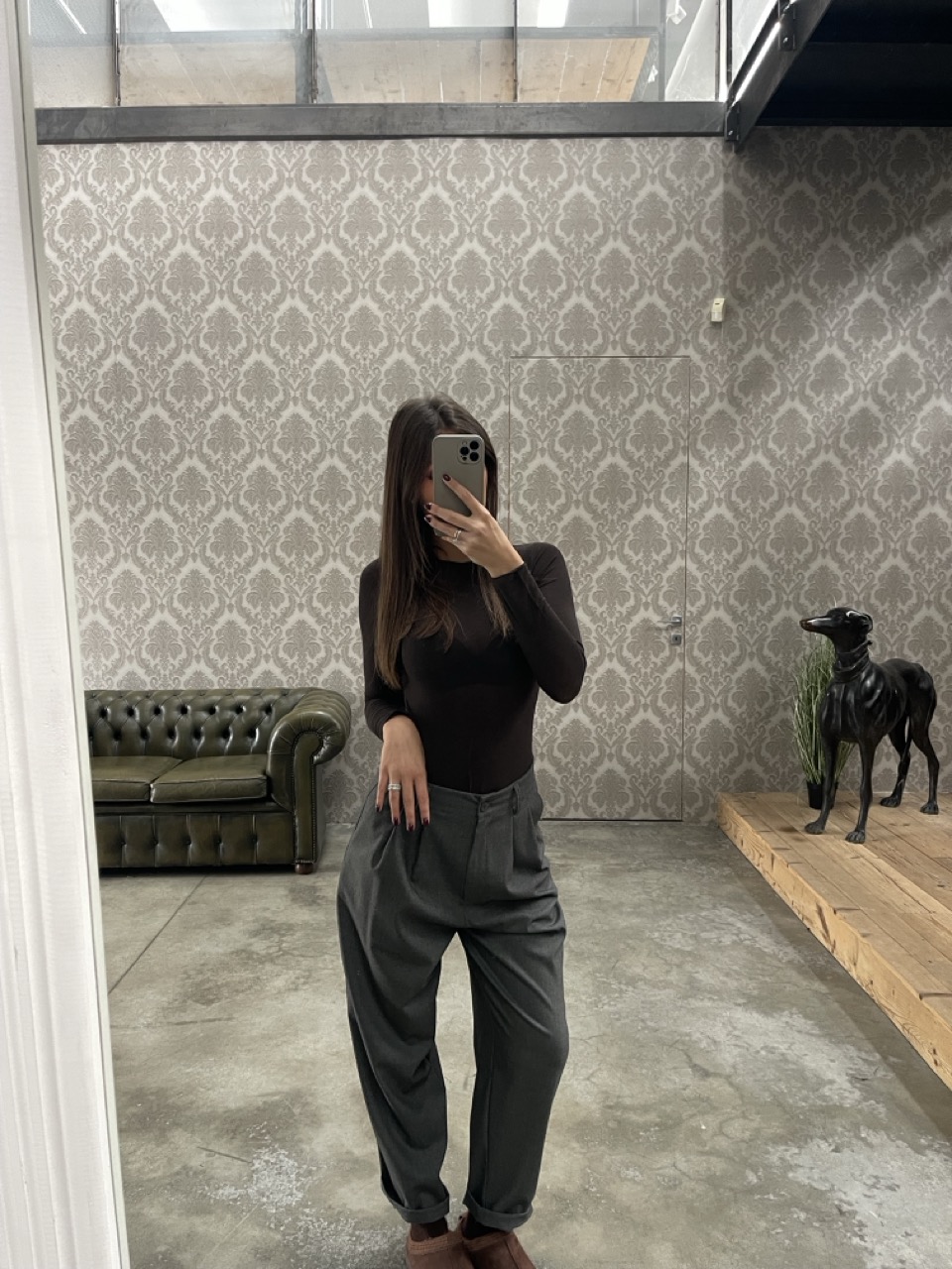 Pantalone modello mom fit a vita medio alta con tasche laterali.