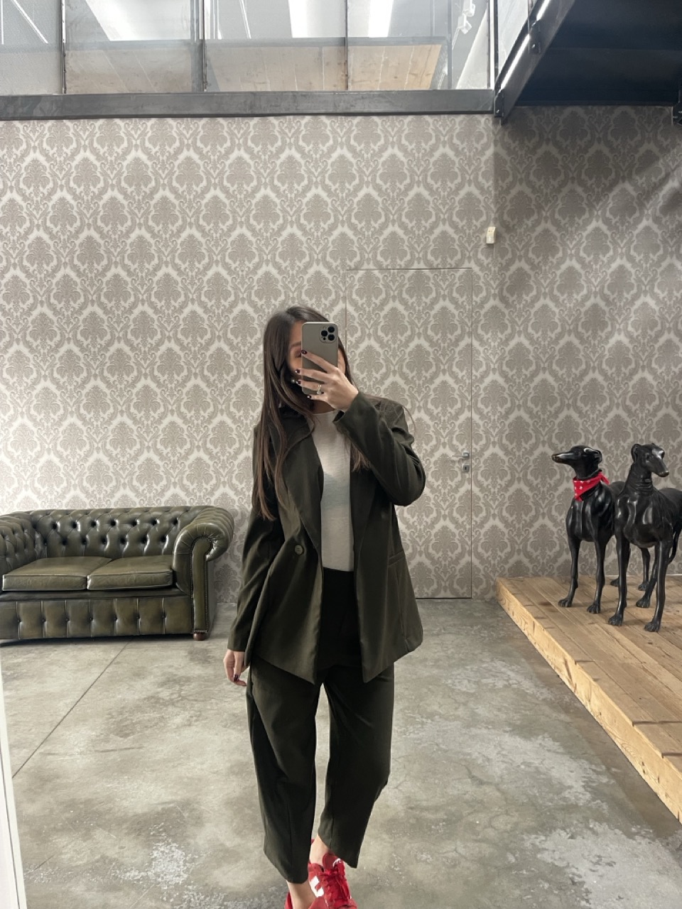 Pantalone modello mom fit a vita medio alta con tasche laterali e chiusura con bottone e zip.