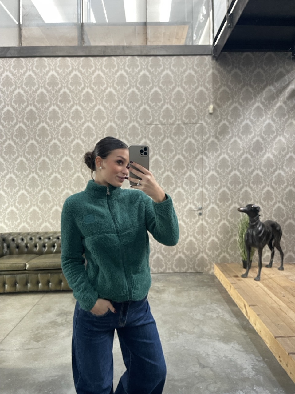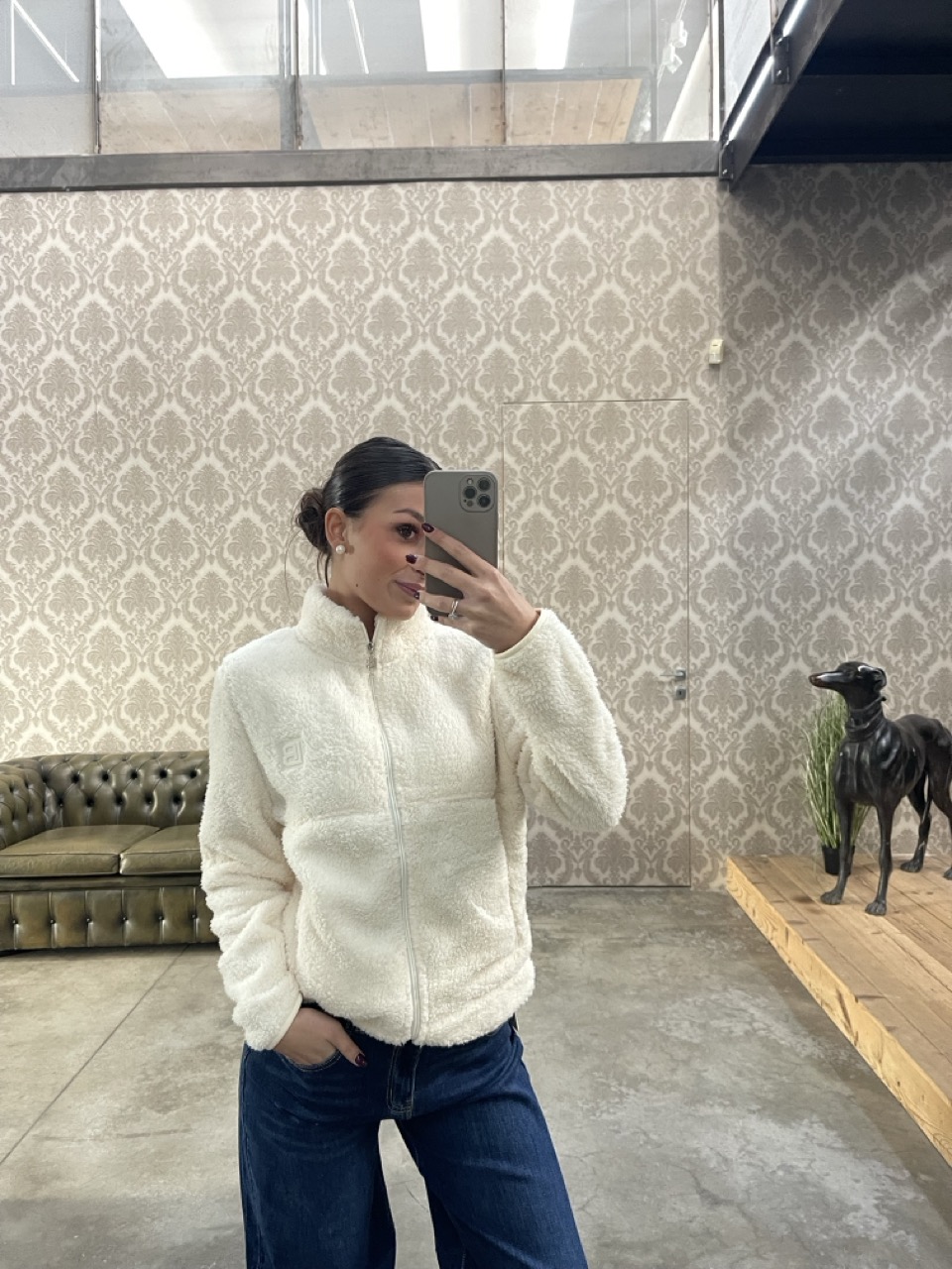 Pile morbido con tasche laterali e zip centrale come chiusura.