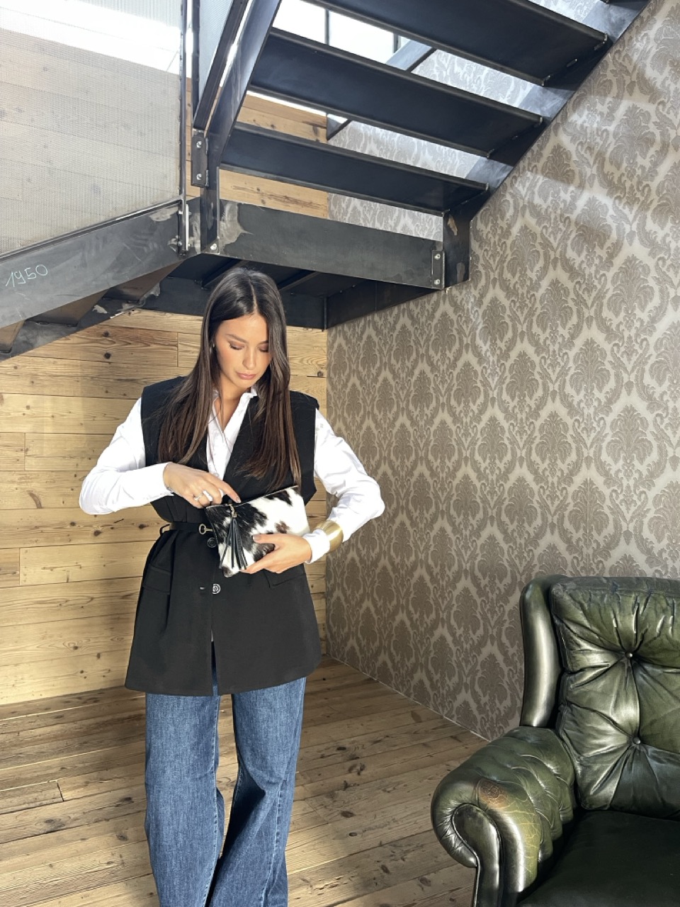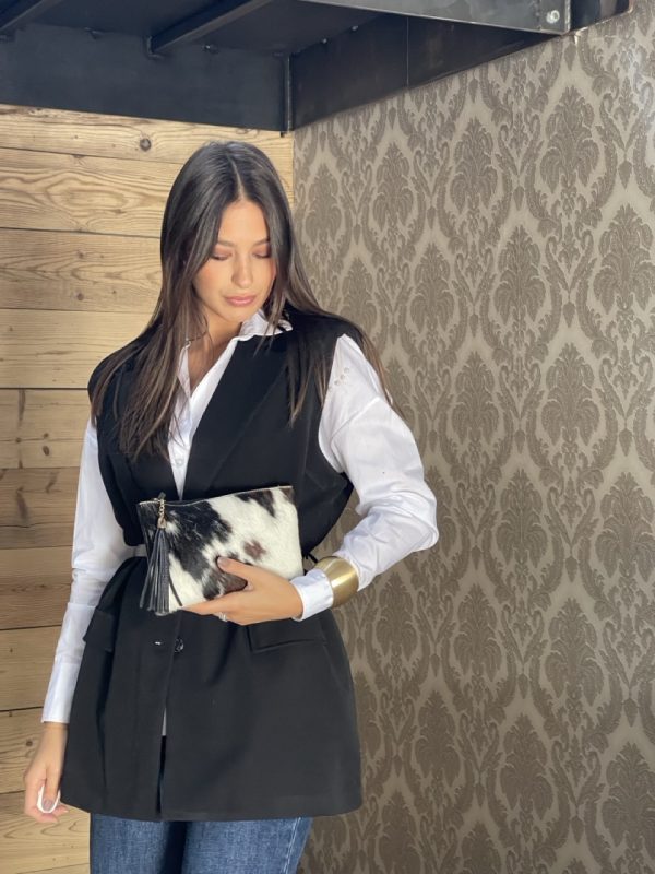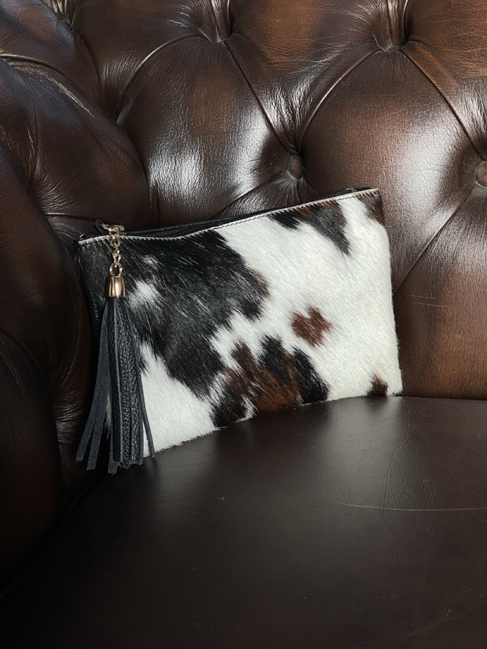 Pochette in fantasia muccata in vera pelle con zip come chiusura e tracolla all’interno.