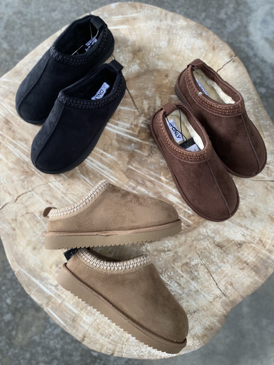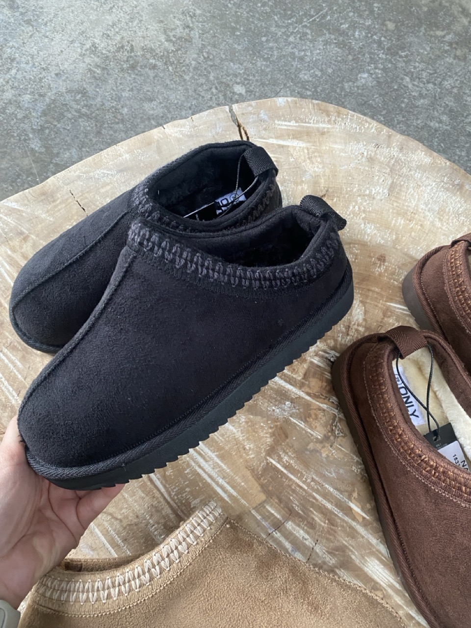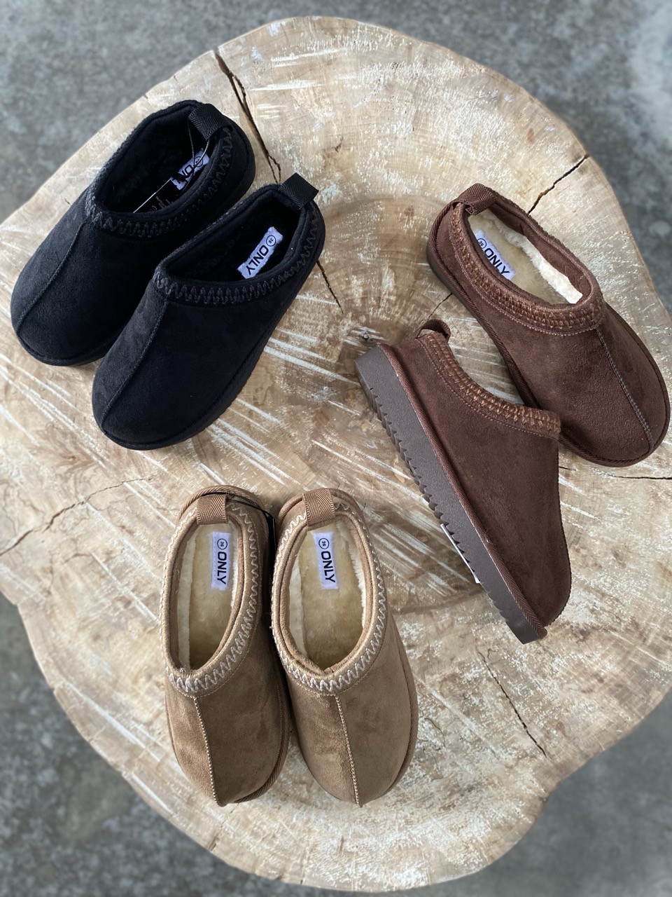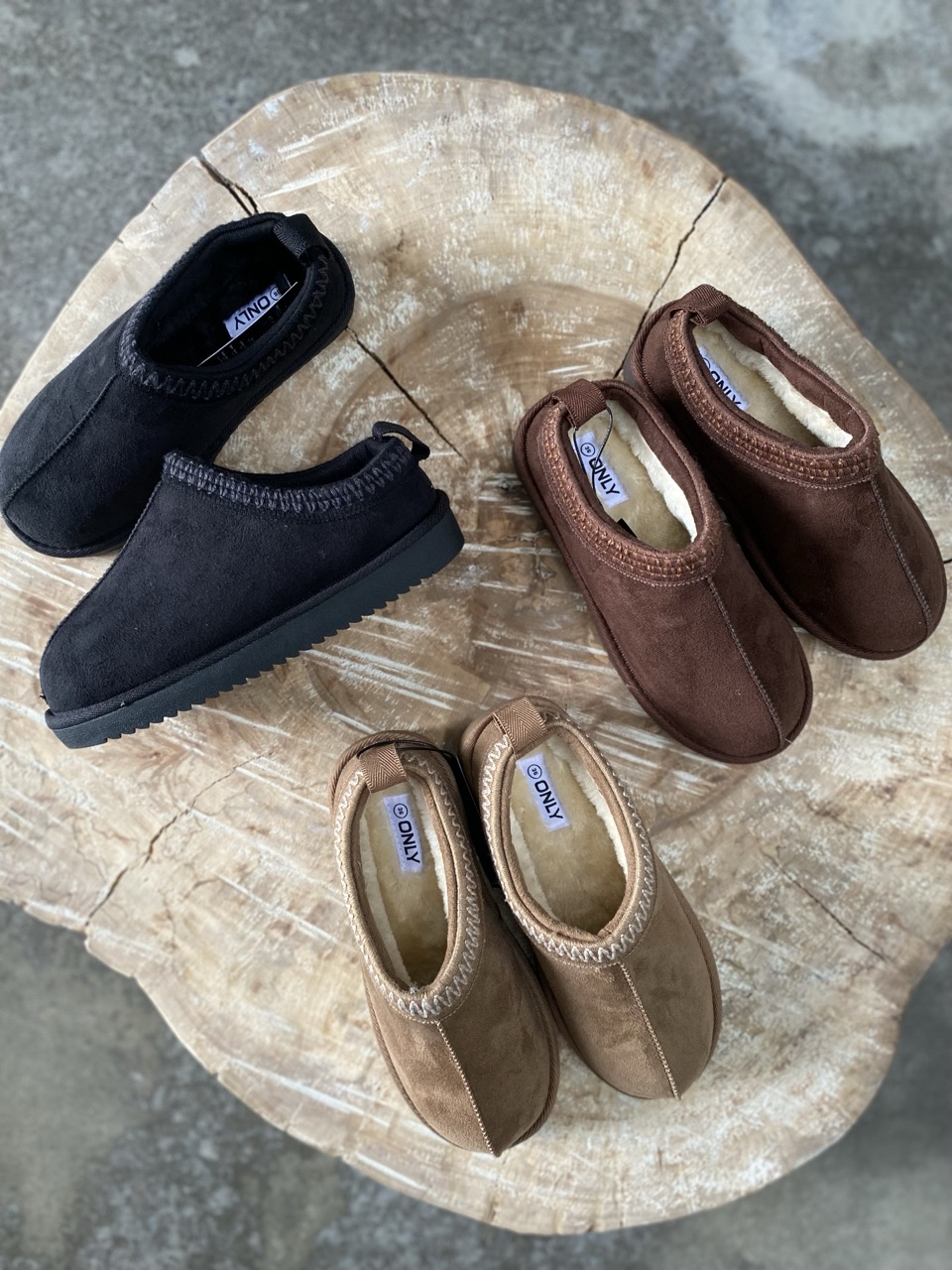 Sabot ONLY scamosciate con pelo all’interno e ricami dettaglio.
