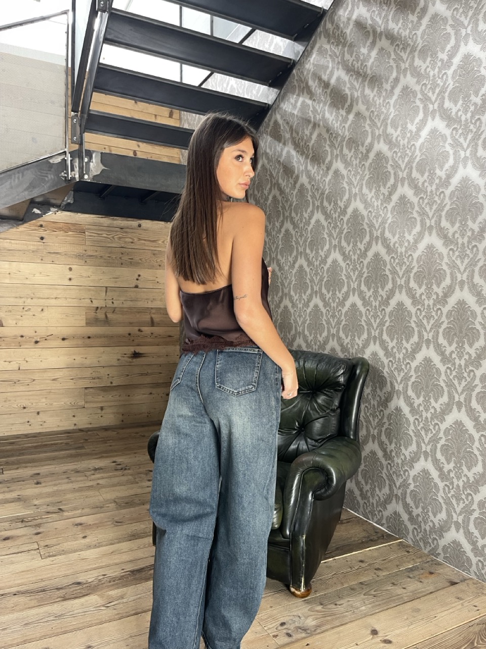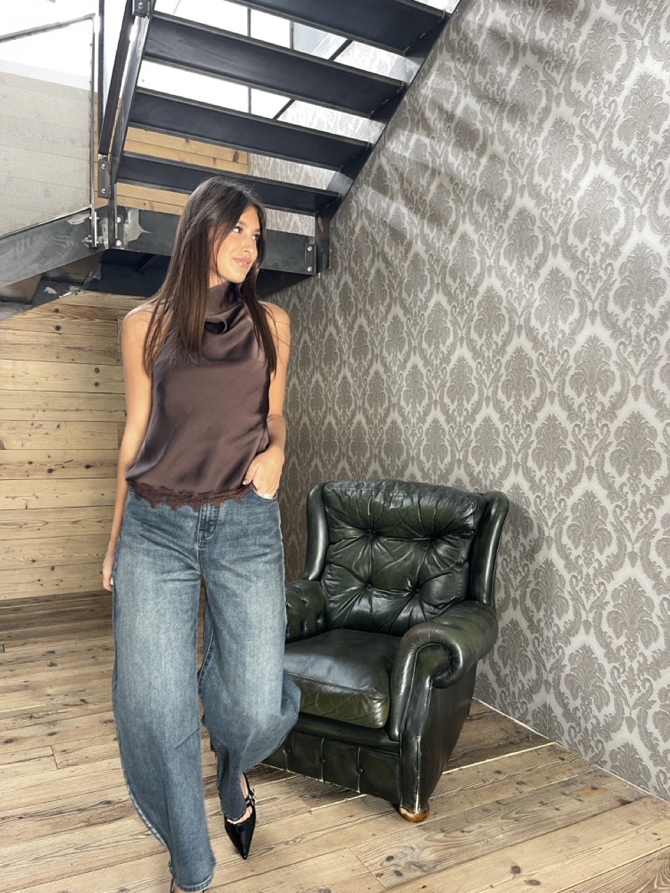 Top effetto raso con pizzo dettaglio e bottoni dietro come chiusura.