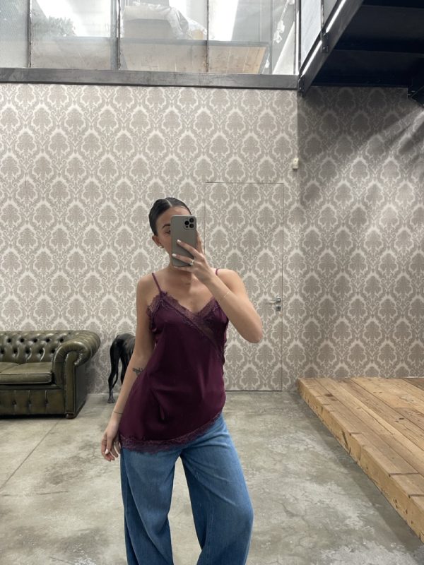 Top effetto raso con spalline fini regolabili e pizzo dettaglio.