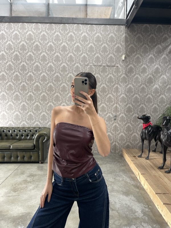 Top TENSIONE IN in ecopelle senza spalline con zip dietro come chiusura.