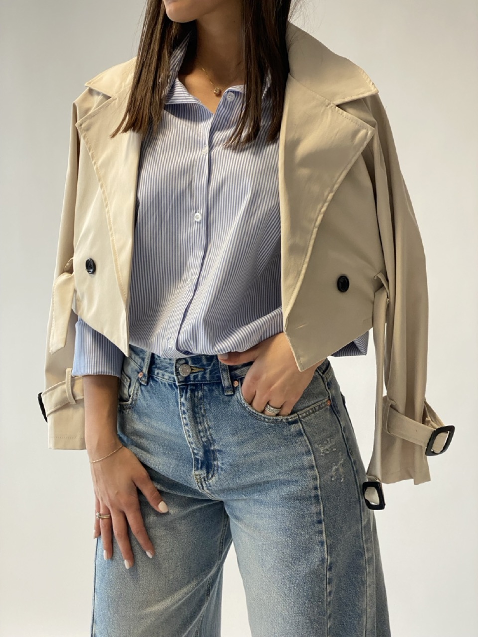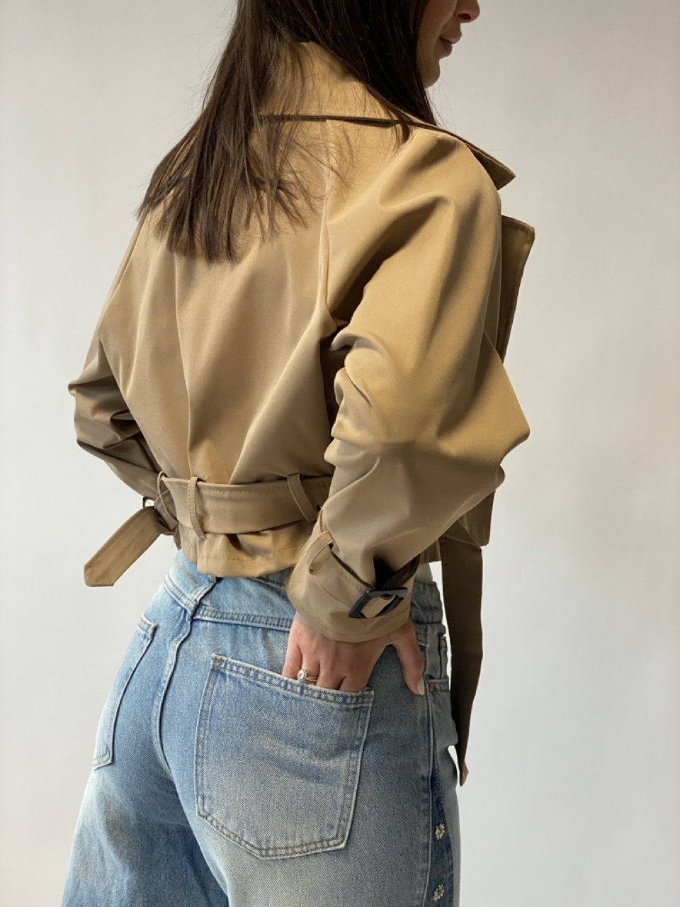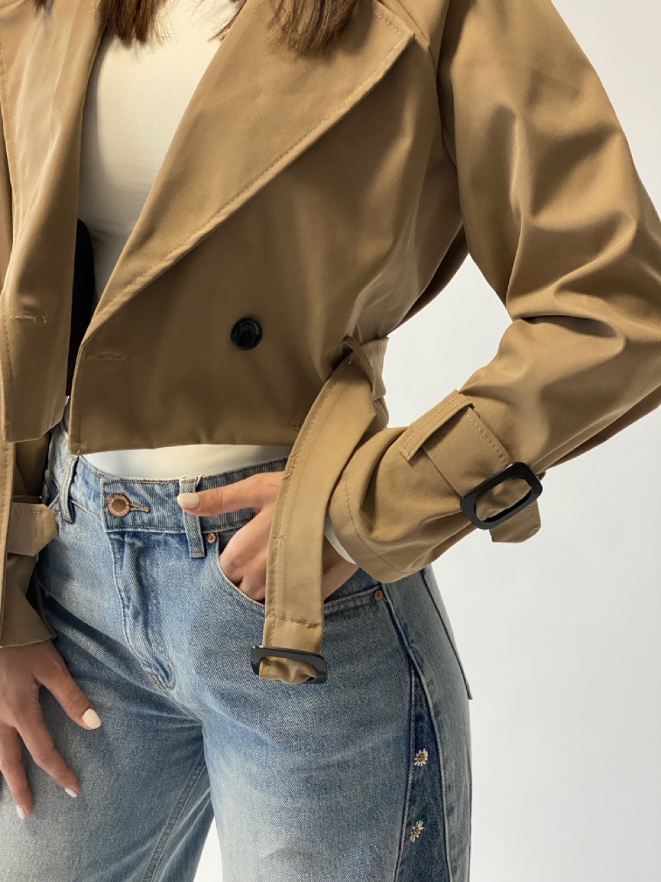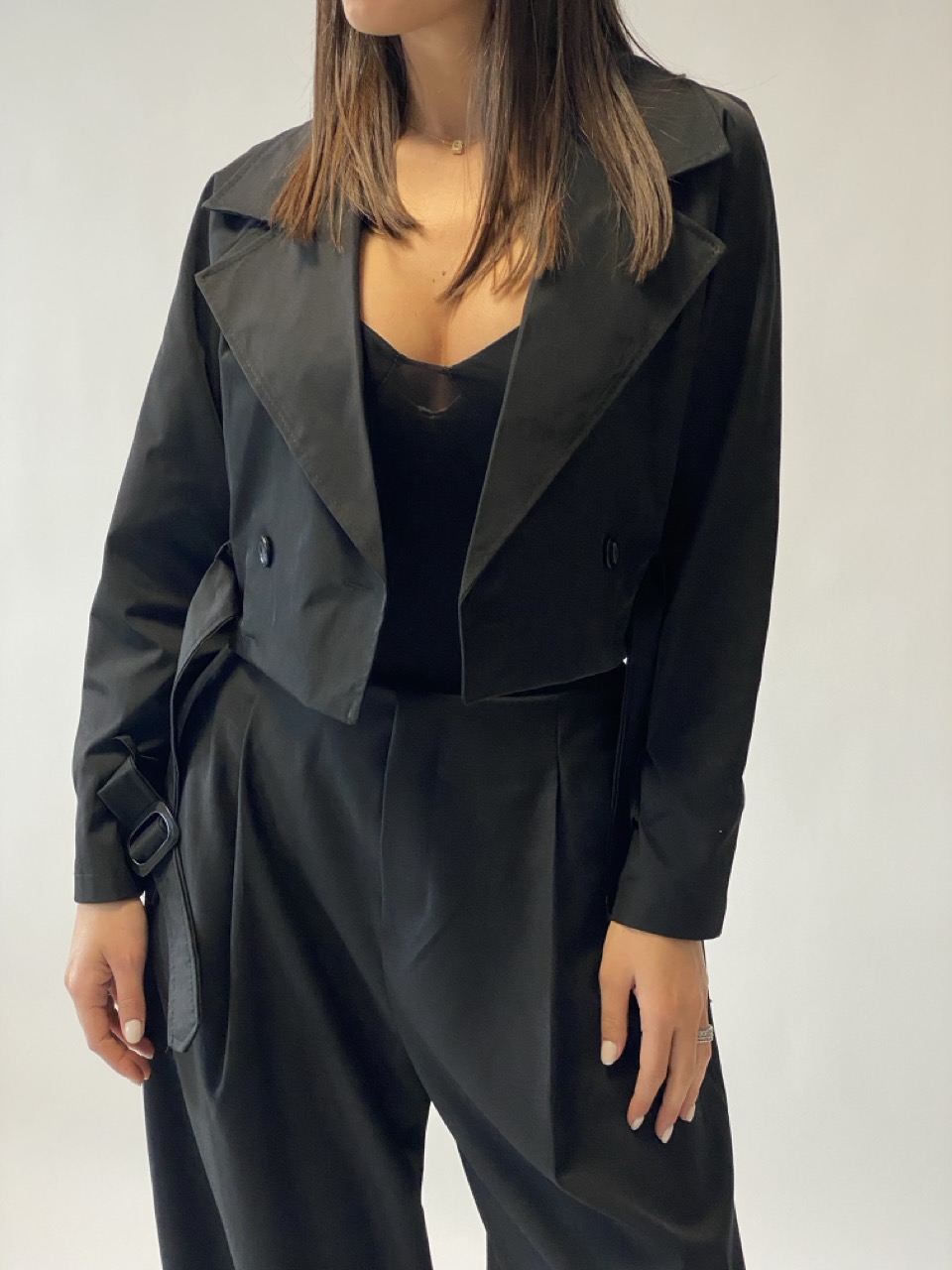 Trench crop modello doppiopetto con cintura in vita.