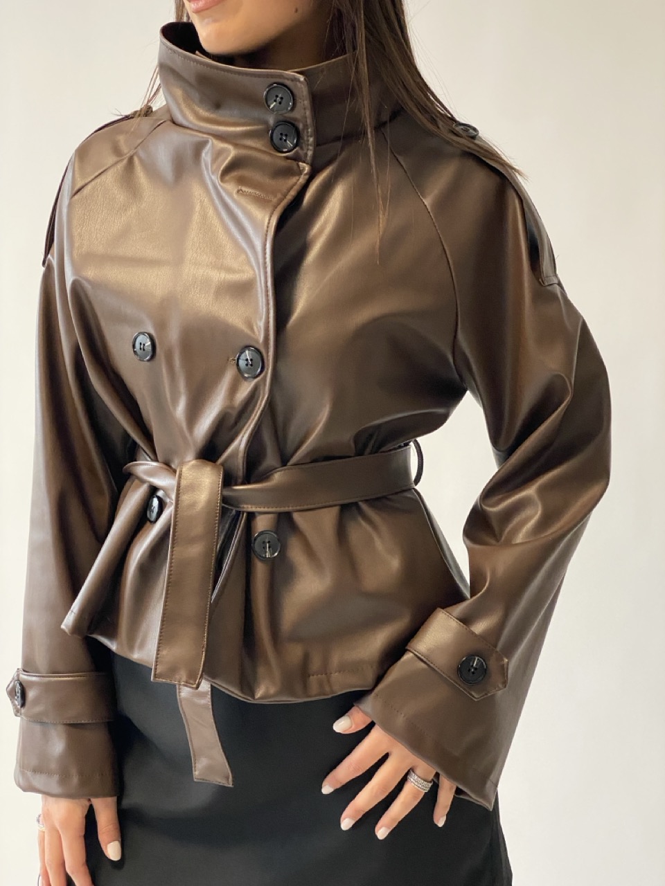 Trench in ecopelle modello doppiopetto con cintura in vita e chiusura con bottoni centrali.
