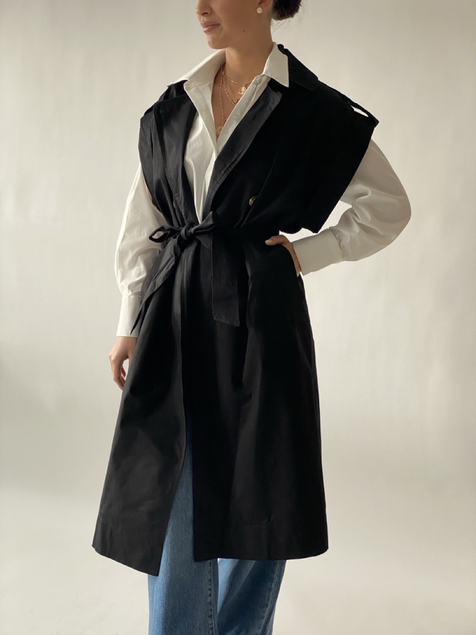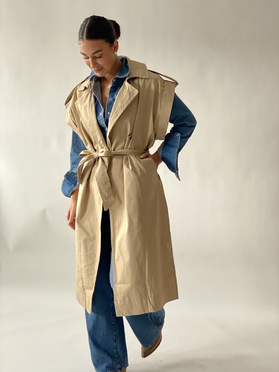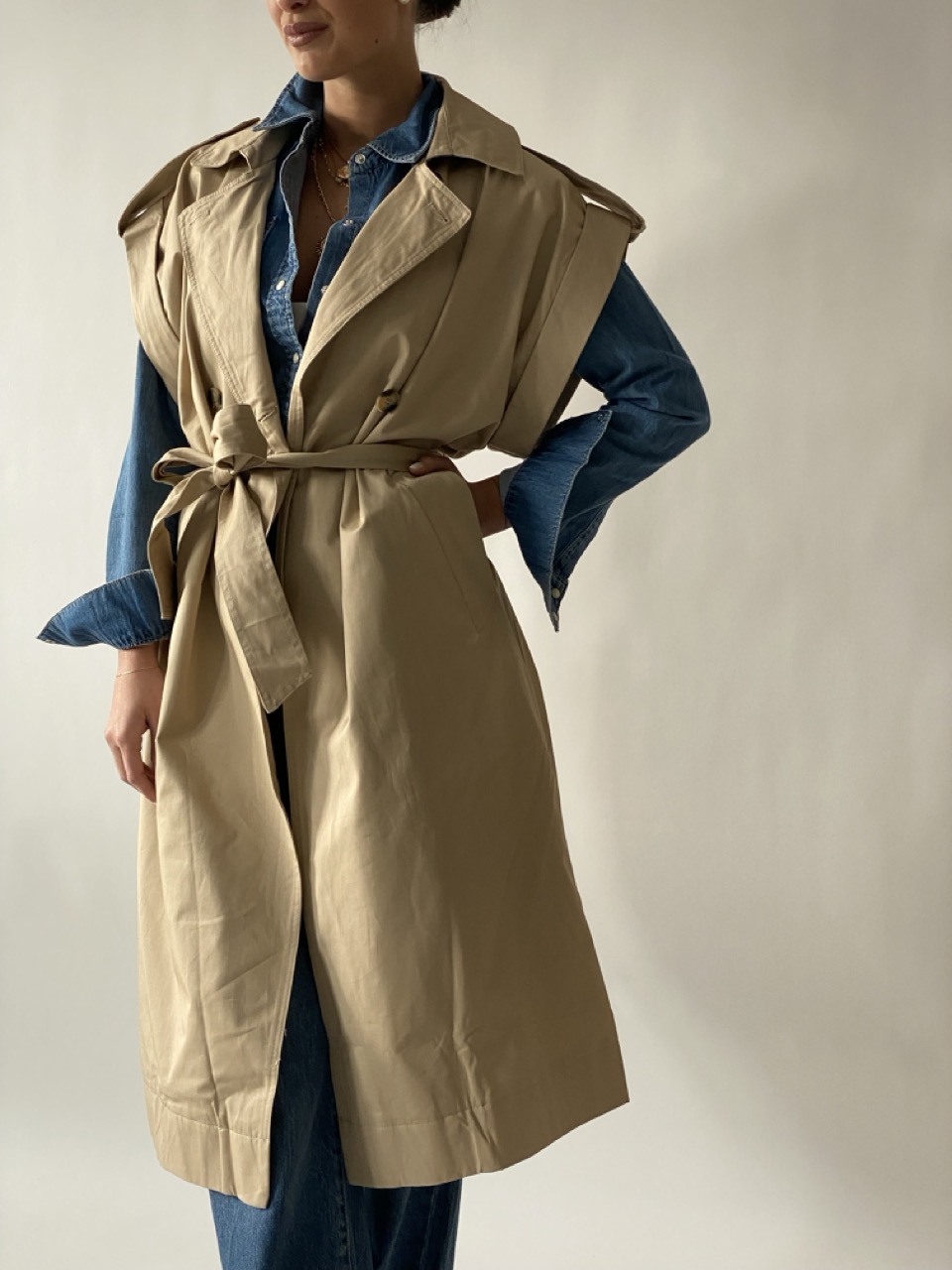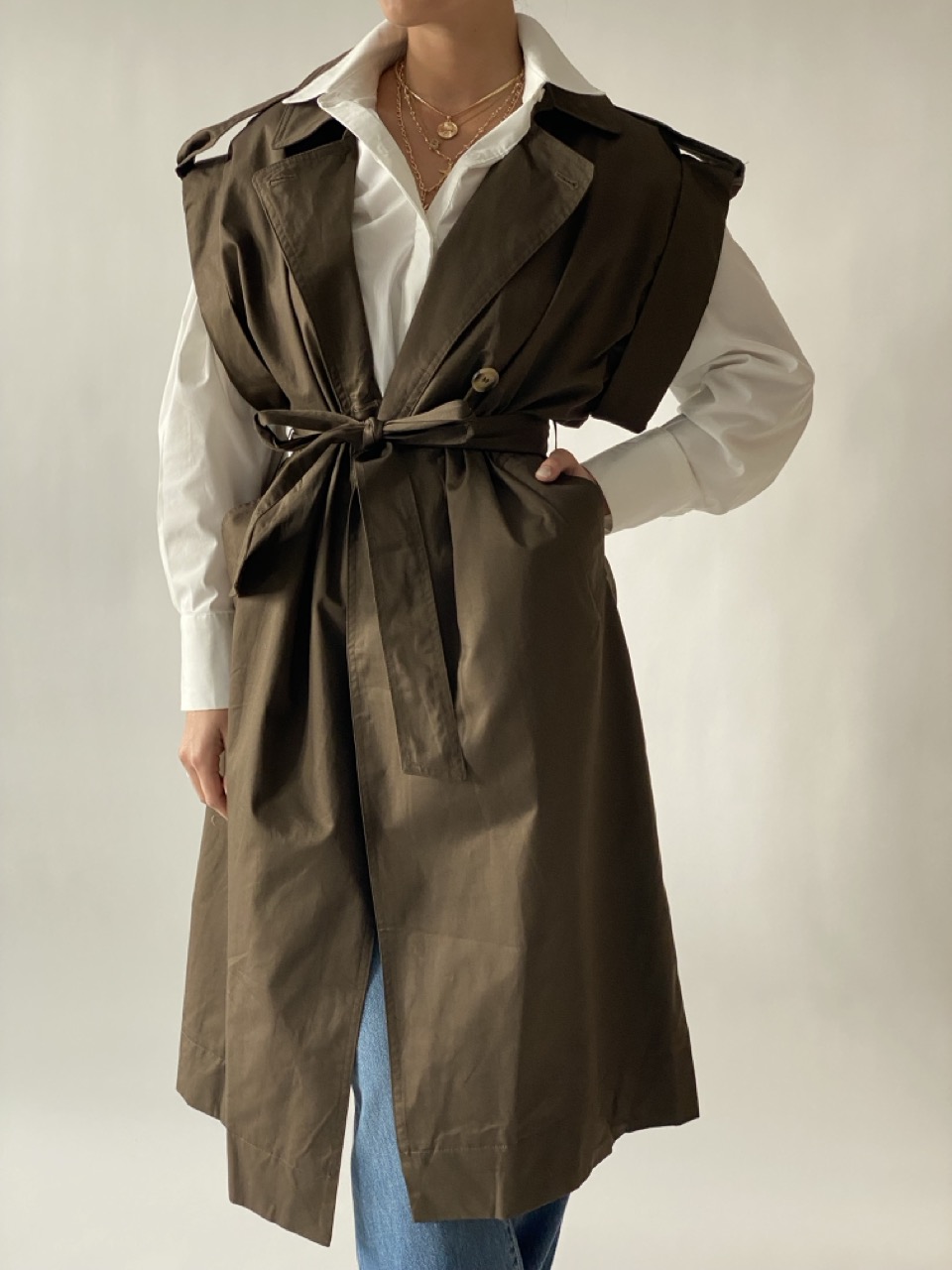 Trench midi smanicato con tasche laterali e cintura in vita.
