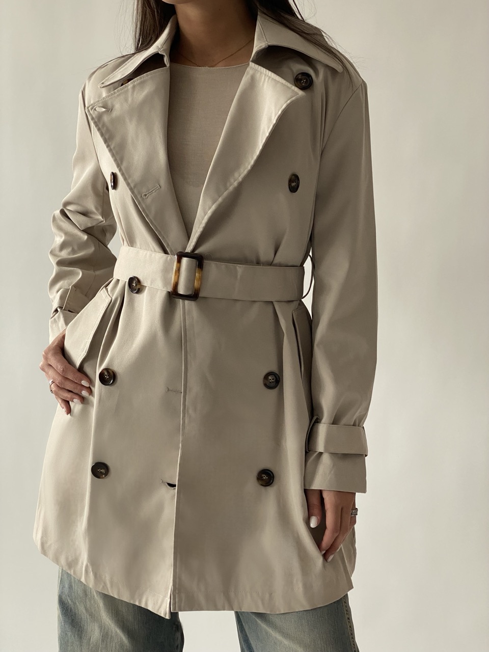 Trench midi modello doppiopetto con tasche laterali e cintura in vita.